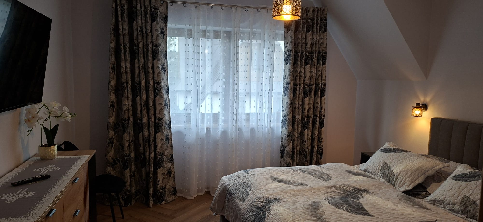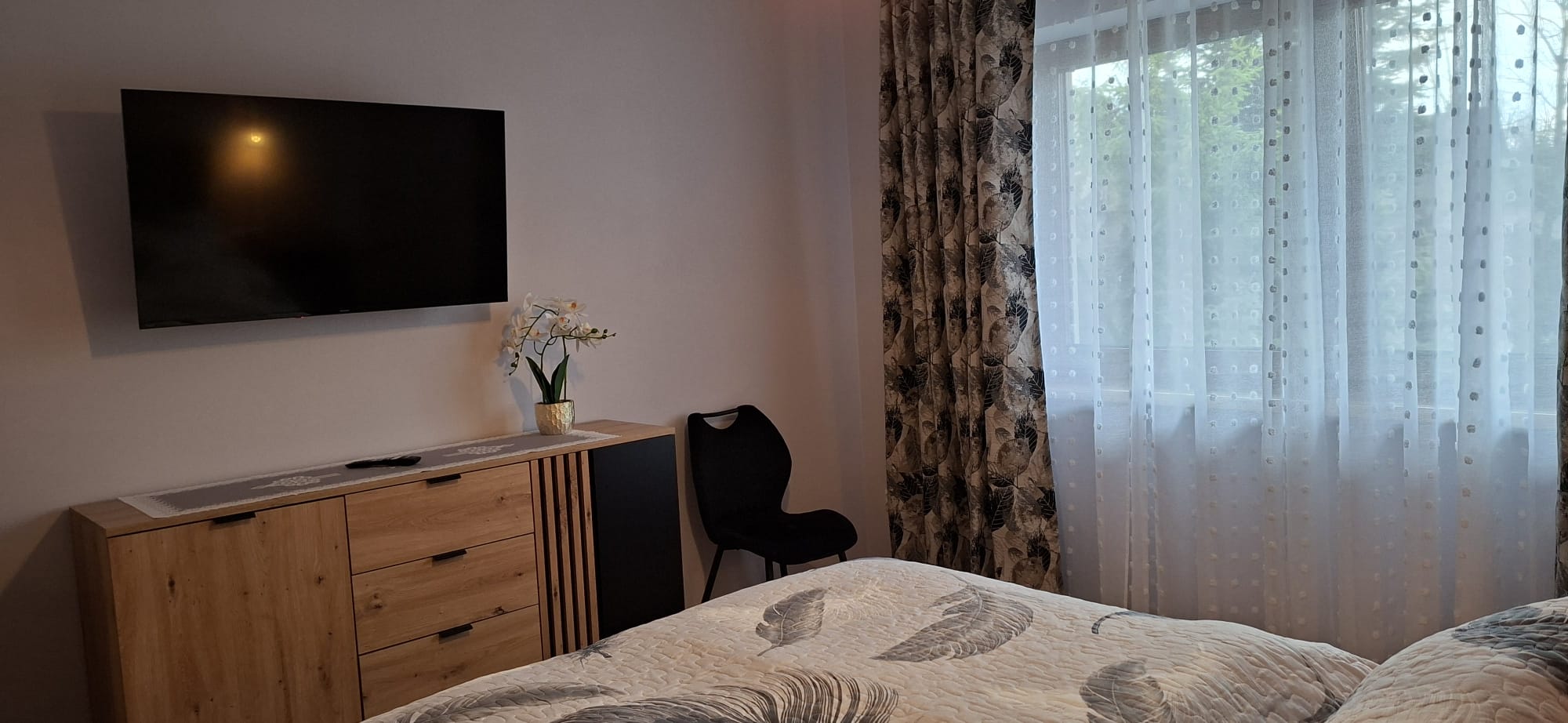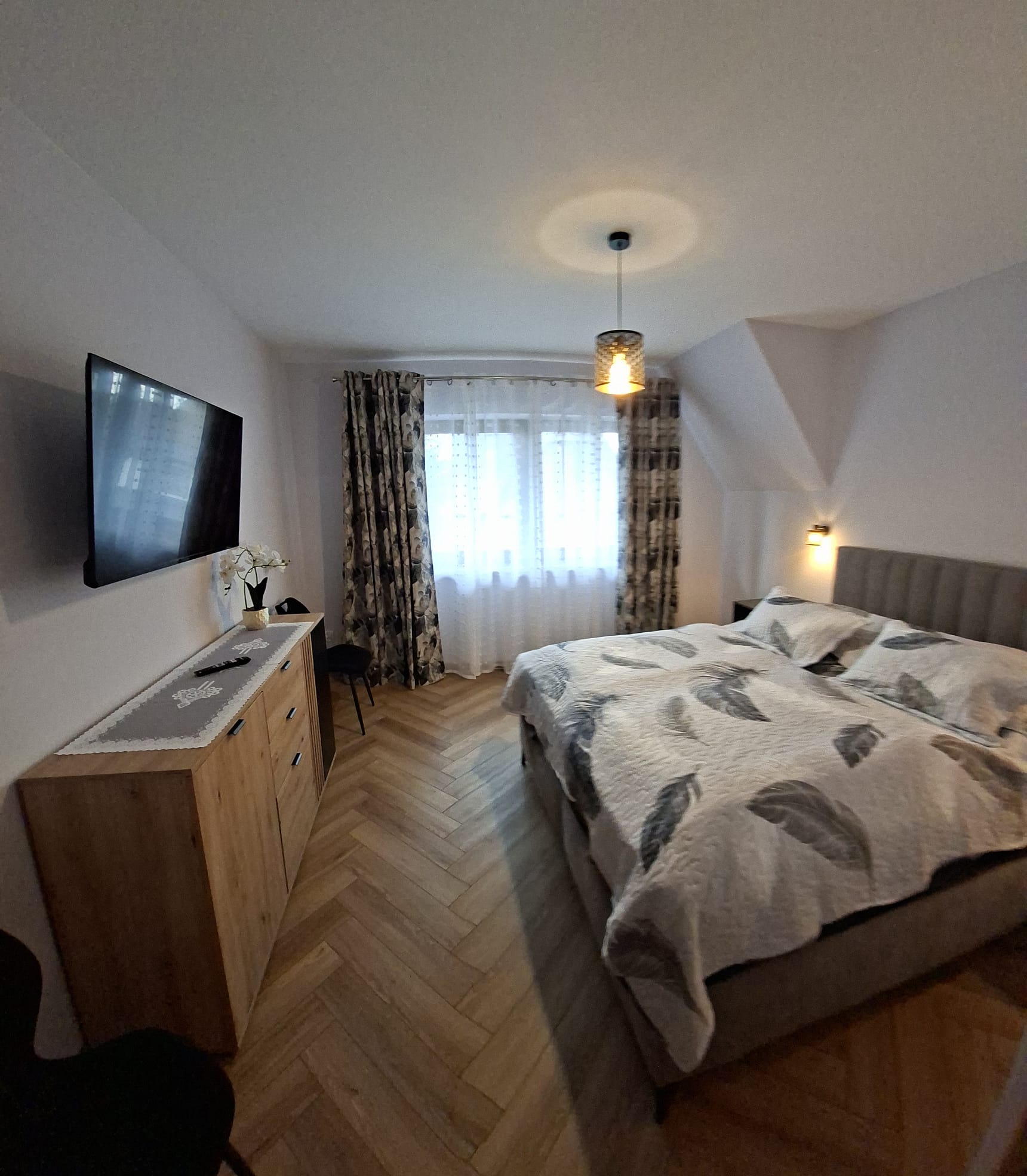 • Sypialnia – wygodne łóżko małżeńskie, szafki nocne, TV oraz komoda