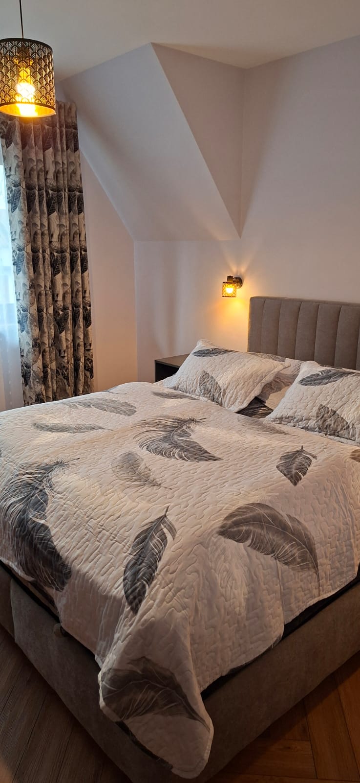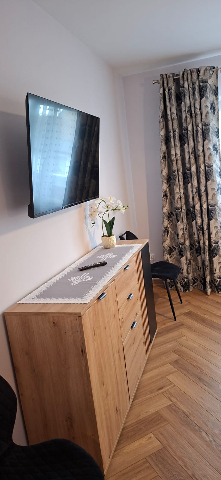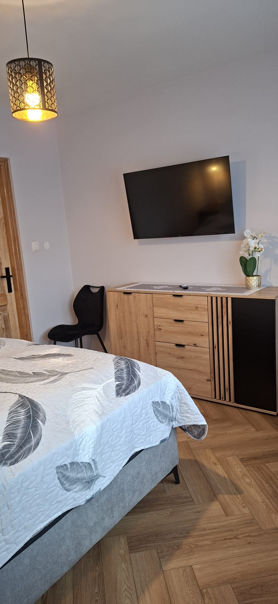 • Sypialnia – wygodne łóżko małżeńskie, szafki nocne, TV oraz komoda