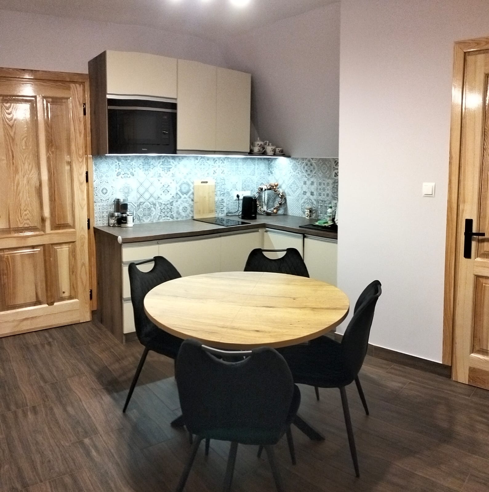 • w pełni wyposażona kuchnia z jadalnią – lodówka, płyta indukcyjna, mikrofalówka, zmywarka oraz komplet akcesoriów kuchennych