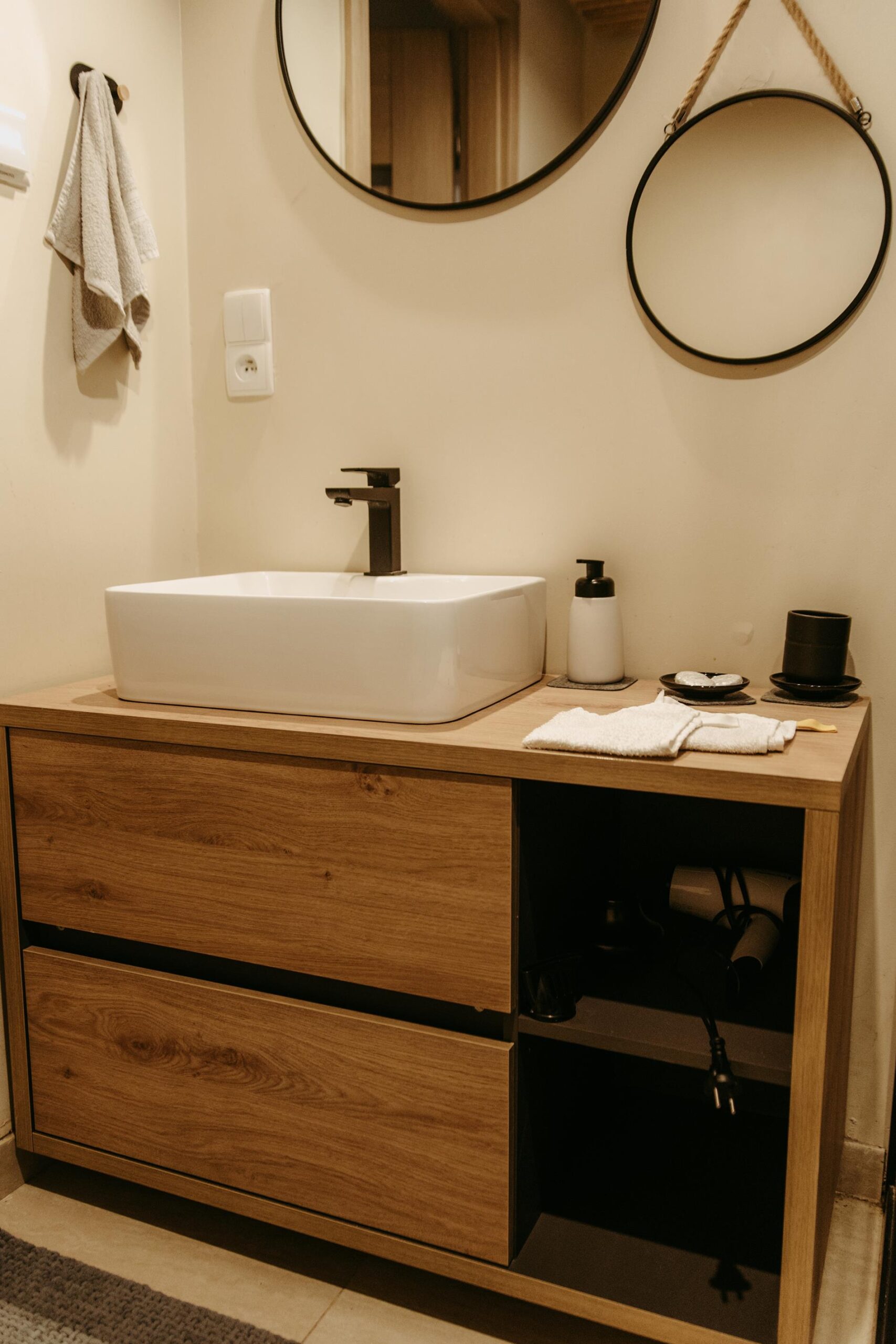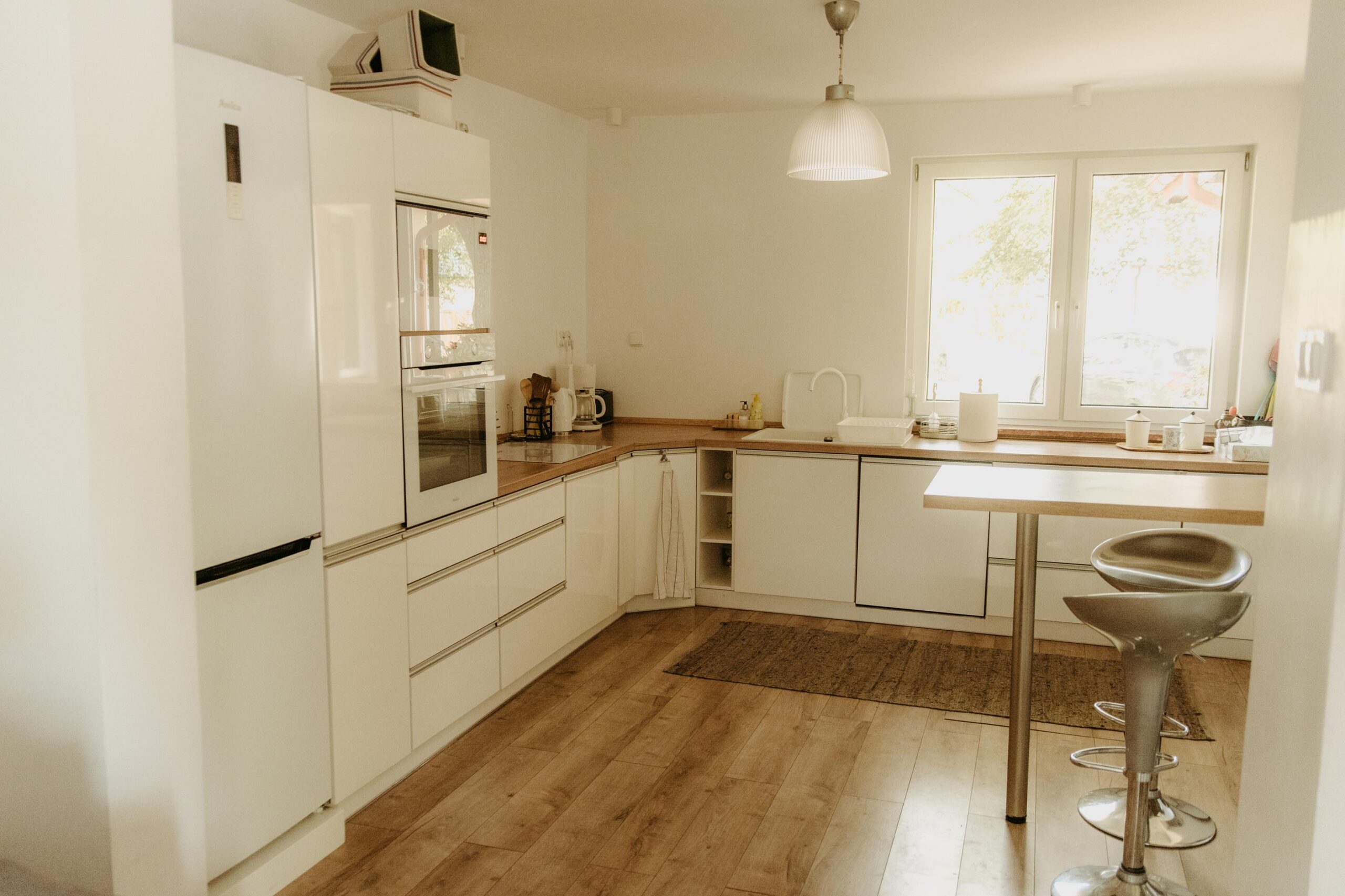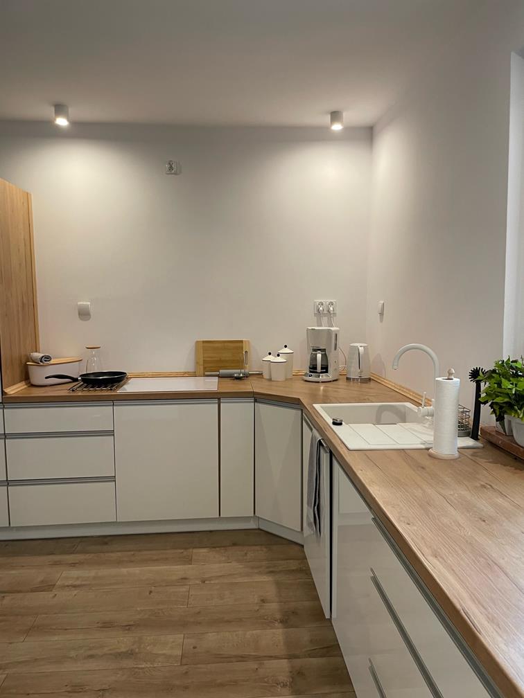 W pełni wyposażona kuchnia: zmywarka, piekarnik, mikrofalówka, płyta indukcyjna, czajnik, ekspres przelewowy, mikser oraz pełen zestaw naczyń i garnków.