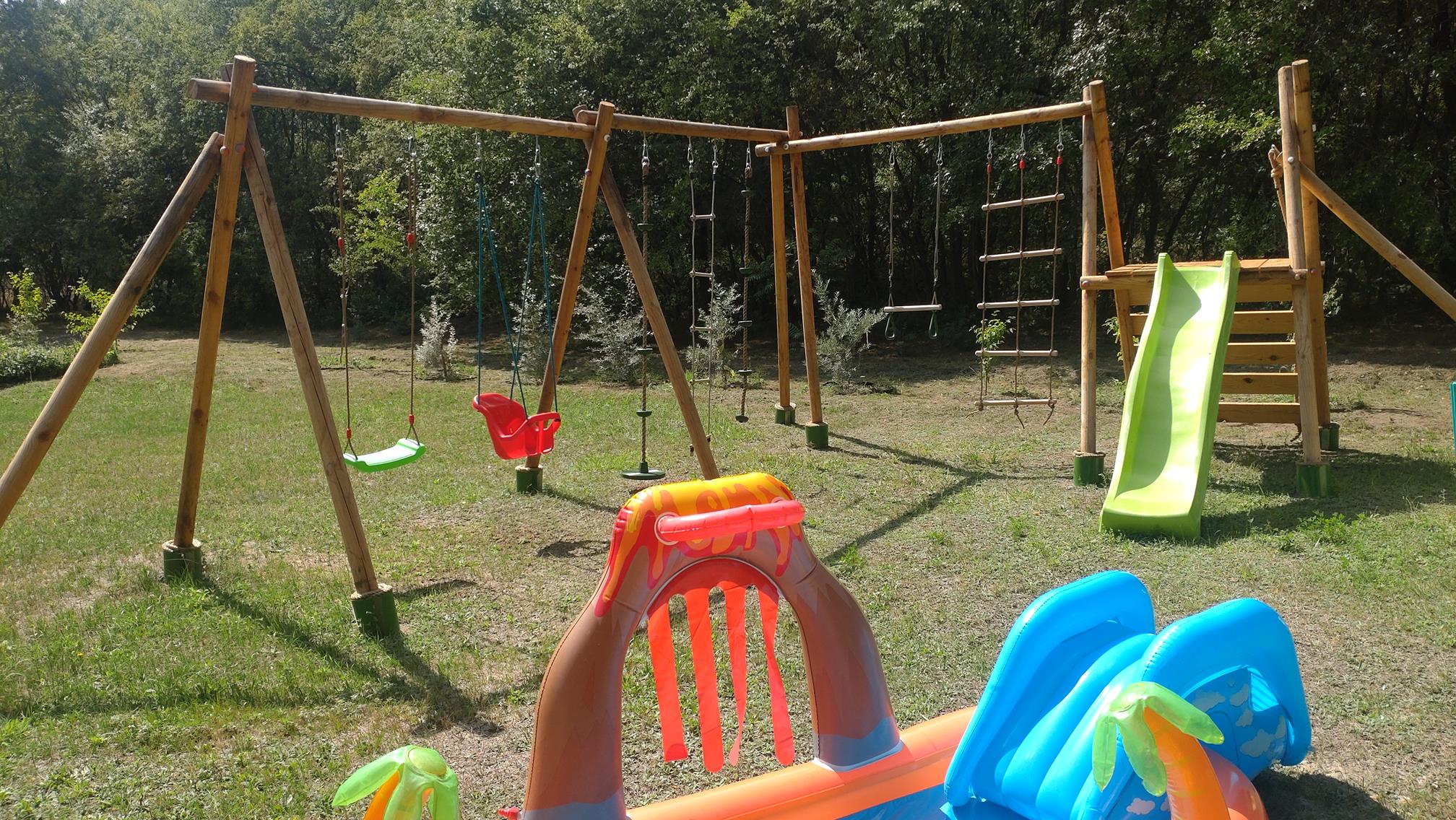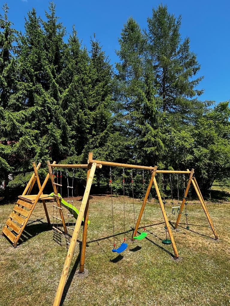 • plac zabaw (huśtawki, zjeżdżalnia, domek, basenik)