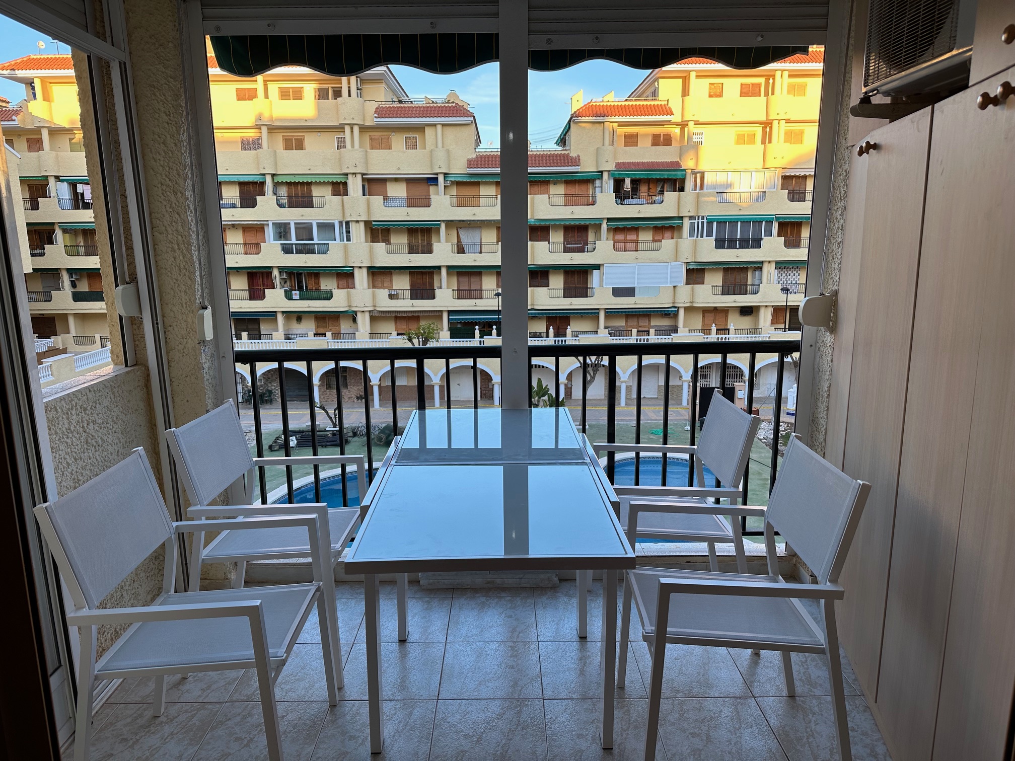 Apartament dla max 6 osób z autem w cenie, do odbioru z pod lotniska Alicante. Miejscowość La Mata, Torrevieja, na zamkniętym osiedlu z basenem czynnym cały rok, II piętro, 2 windy, z balkonem (widok na basen)