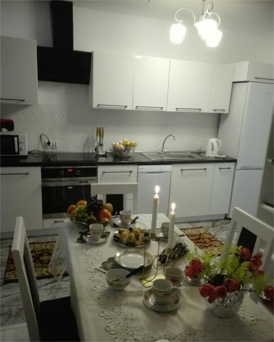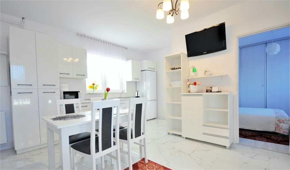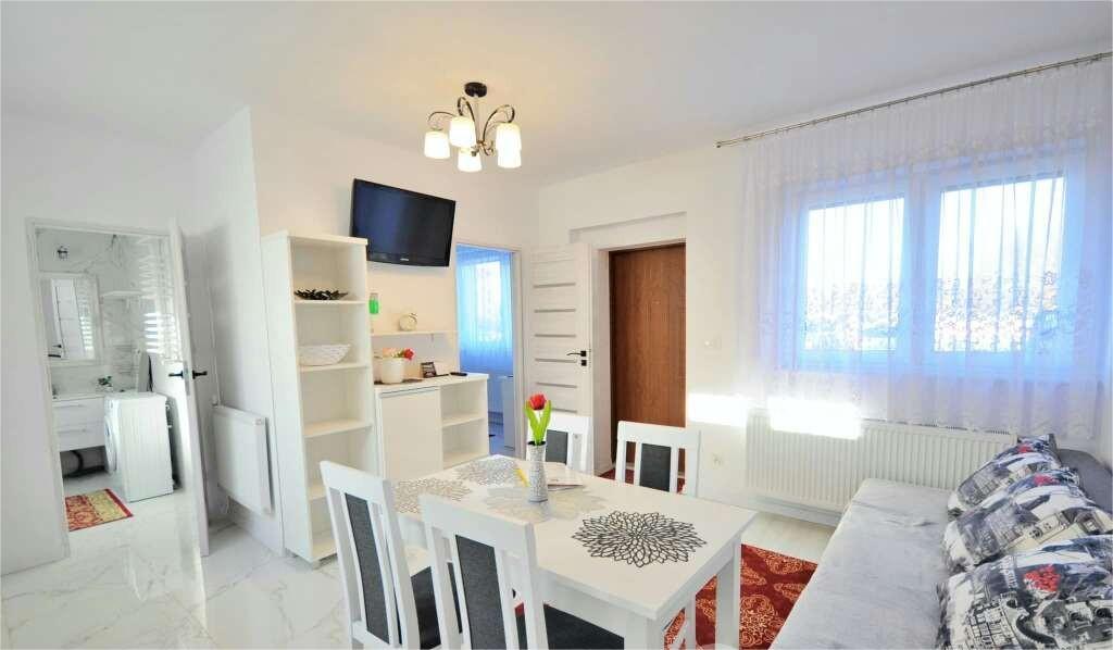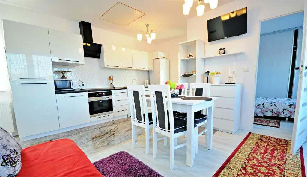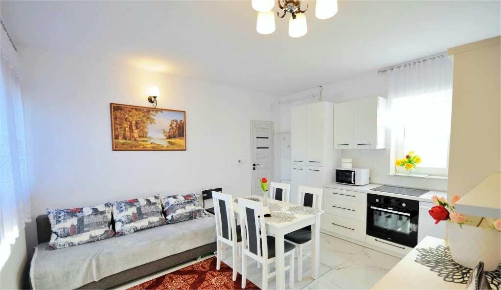 salon z rozkładaną sofą 2 osobową oraz dużą, w pełni wyposażoną kuchnią