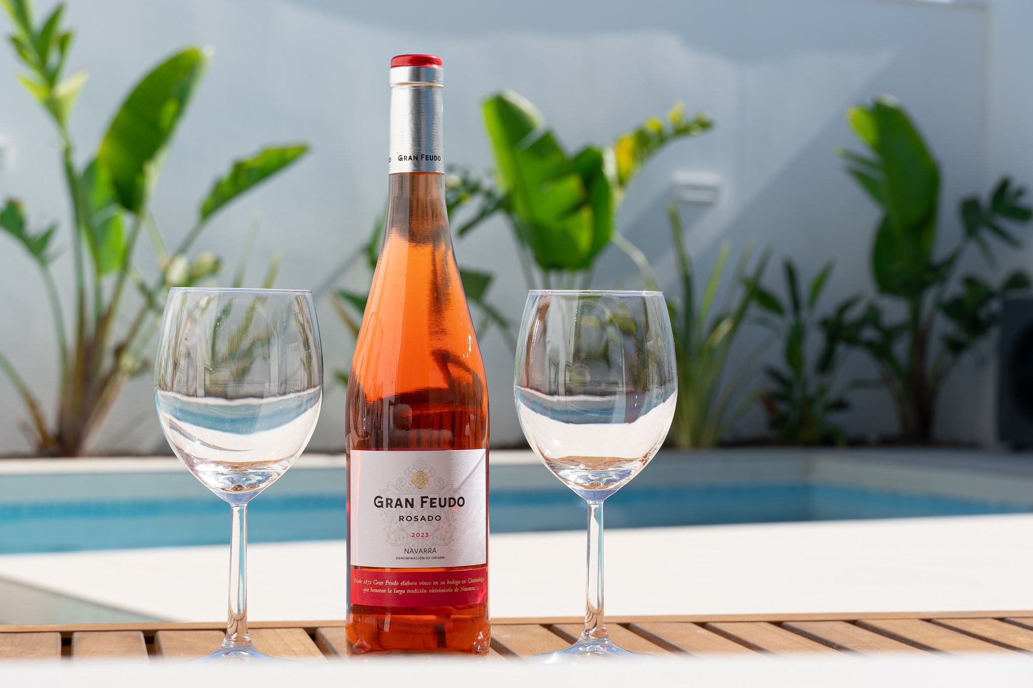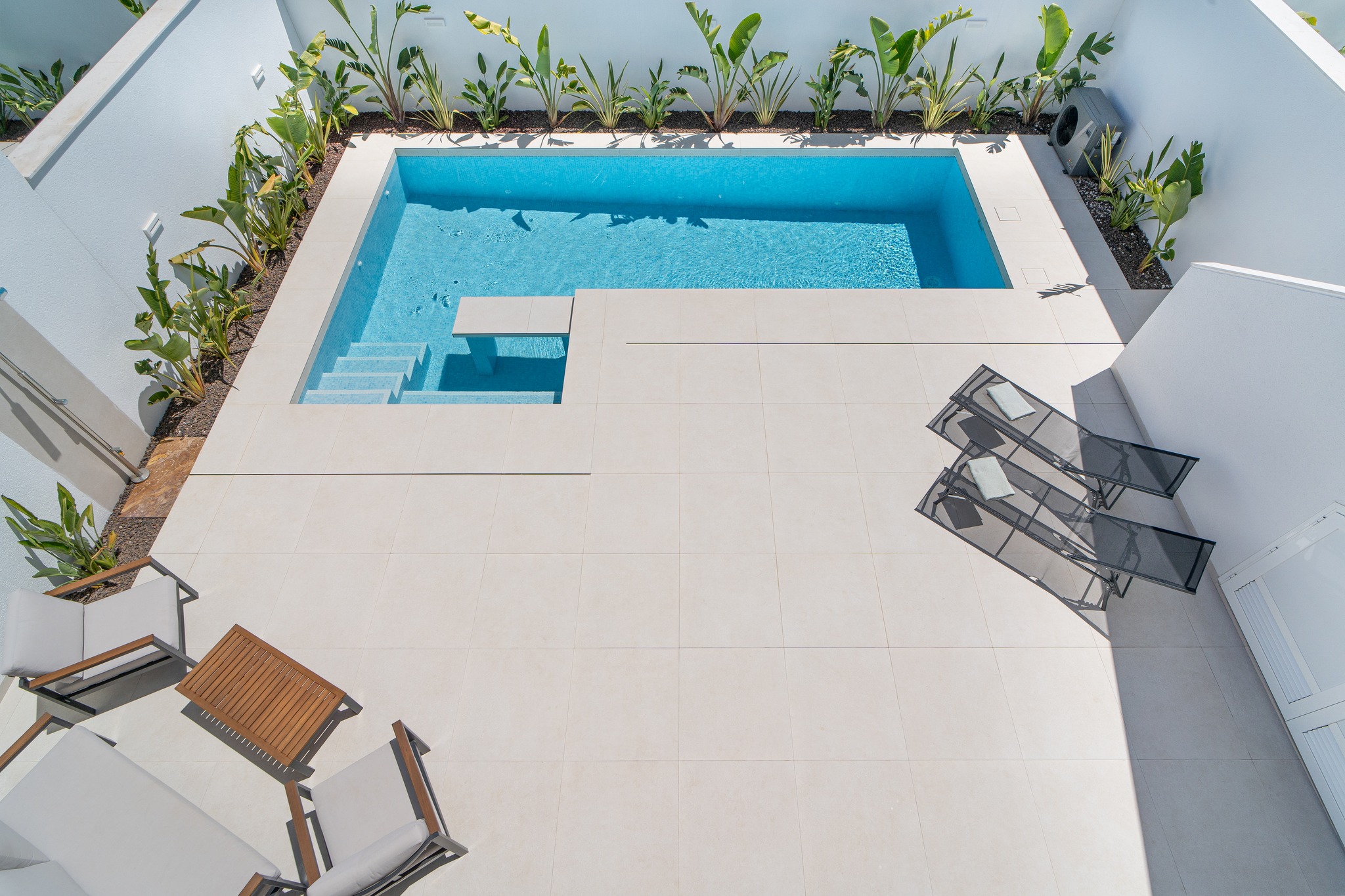 Prywatny basen z leżakami i zielonym ogrodem – relaks w pełnym słońcu.